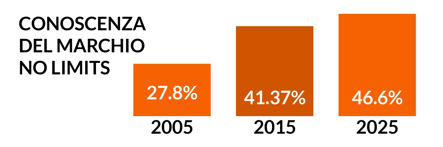 Nel 2025 NO LIMITS ha commissionato alla rinomata agenzia BVA Doxa un’approfondita indagine di mercato per misurare, con dati concreti, quanto già era percepito sul mercato: la forte riconoscibilità e solidità del marchio.